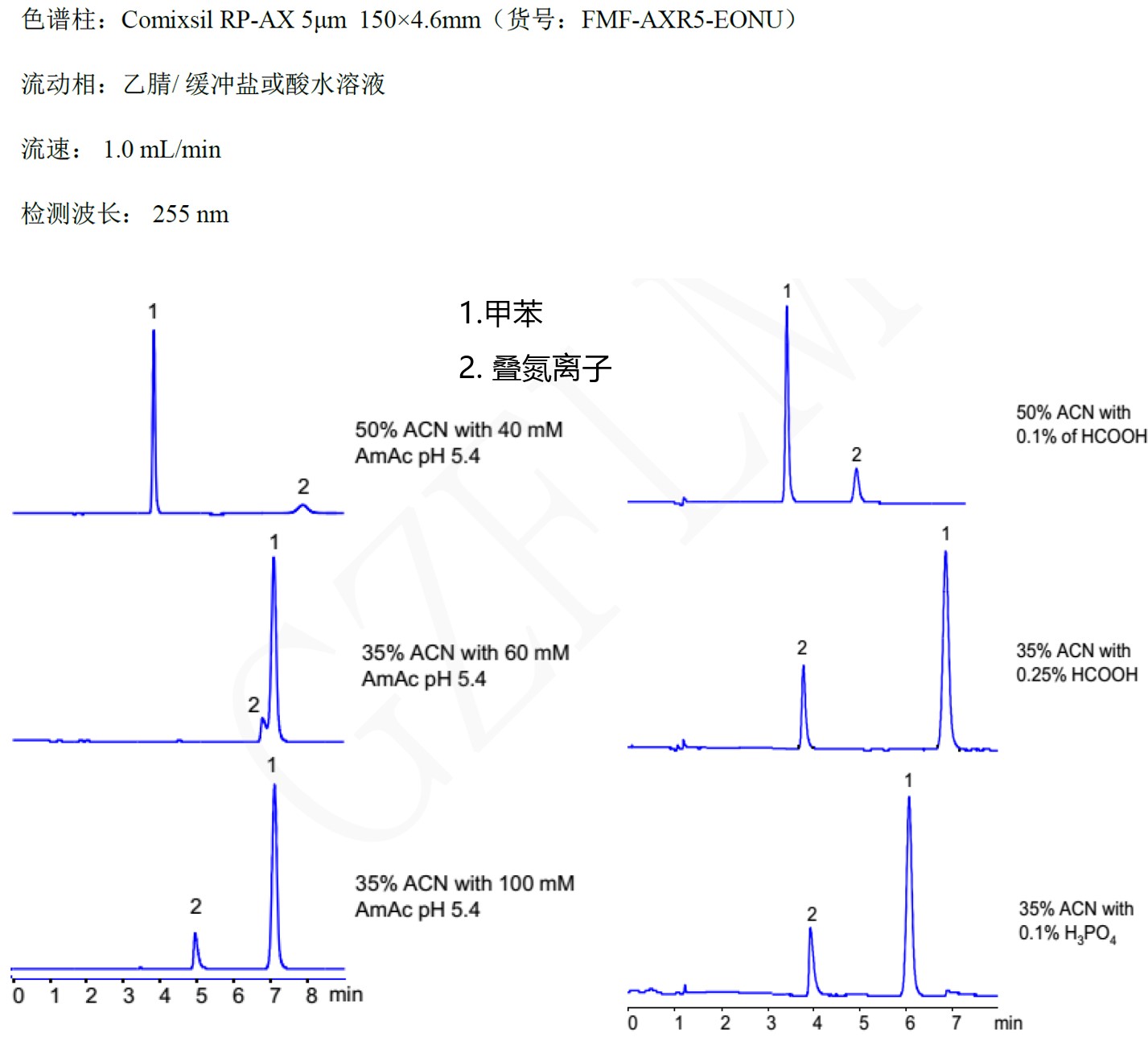 2. Comixsil RP-AX同時(shí)保留大極性疊氮離子和疏水小極性甲苯: