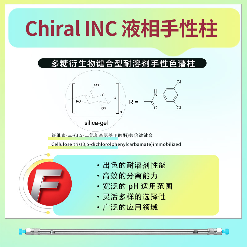 固定相:Chiral INC 鍵合型耐溶劑手性柱的固定相為纖維素-三-(3,5-二氯苯基氨基甲酸酯)共價鍵鍵合(Cellulose tris(3,5-dichlorolphenylcarbamate)immobilized)。這種特殊的固定相設(shè)計使得該手性柱具有優(yōu)異的手性識別能力和分離效率。