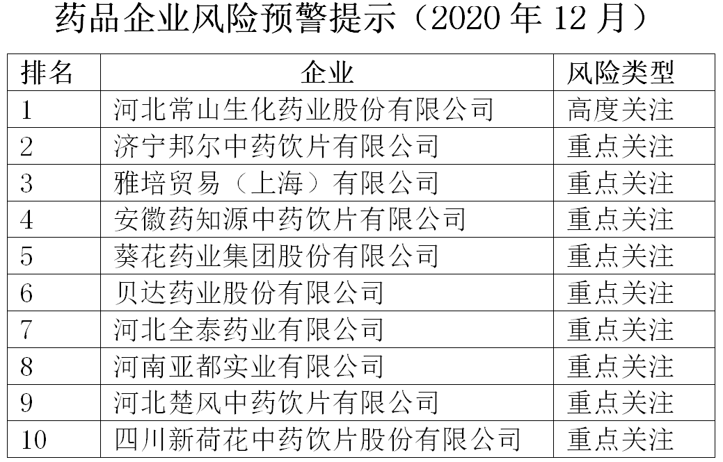 近日,中國健康傳媒集團(tuán)輿情監(jiān)測中心發(fā)布藥品企業(yè)風(fēng)險預(yù)警提示(2020年12月),公開風(fēng)險指數(shù)排名前十的企業(yè)。河北常山生化藥業(yè)股份有限公司(以下簡稱常山藥業(yè))排名第一,為“高度關(guān)注企業(yè)”;濟(jì)寧邦爾中藥飲片有限公司、雅培貿(mào)易(上海)有限公司、安徽藥知源中藥飲片有限公司、葵花藥業(yè)集團(tuán)股份有限公司、貝達(dá)藥業(yè)股份有限公司、河北全泰藥業(yè)有限公司、河南亞都實業(yè)有限公司、河北楚風(fēng)中藥飲片有限公司、四川新荷花中藥飲片股份有限公司分列第2至10位,為“重點(diǎn)關(guān)注企業(yè)”。