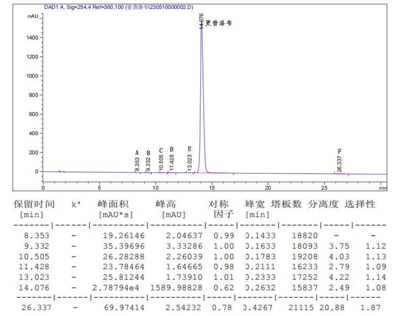 方法說明:依據(jù) EP 標準中檢測更昔洛韋及有關物質(zhì)方法,使用強陽離子交換色譜柱 SuperLu SCX 進行,更昔洛韋及雜質(zhì) A、B、C、D、E、F 就能有效分離,符合要求;對于強陽離子交換柱而言,保留強的化合物在緩沖鹽體系下會洗脫更完全,建議每日使用后用 200mM 磷酸二氫銨(pH3.5)沖洗半個小時,該步驟可較好的維護色譜柱,長時間在乙腈-0.05%TFA 下,對柱子有所損傷的,盡量不要保存過夜。