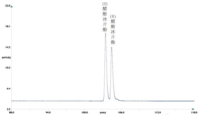 實(shí)際樣品中含有95% -97% 的醋酸冰片酯和3% 的異冰片酯,醋酸冰片酯的s 對映體豐度極高, 樣品用正己烷配制成 lμL/mL。