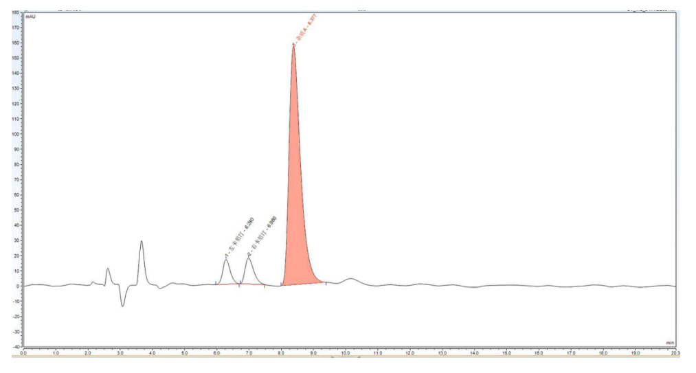 App ID: FLM-B240010 ChiralSuG TAG 手性柱對左卡尼汀,右卡尼汀,雜質(zhì) A 的分離 方法:參照USP 方法,進行流動相比例調(diào)整 流動相:甲醇:0.2%三乙胺(醋酸調(diào) pH 至 6.2)=60:40 色譜柱:ChiralSug TAG 5μ 250*4.6mm(貨號:FMG-TAG-EONU) 流速:0.8 mL/min 檢測:UV205nm, 30oC 樣品濃度:約左卡 1.5mg/ml,右卡 1.5mg/ml,雜A0.25mg/ml 進樣量:10 μL 溶劑:甲醇 色譜圖: