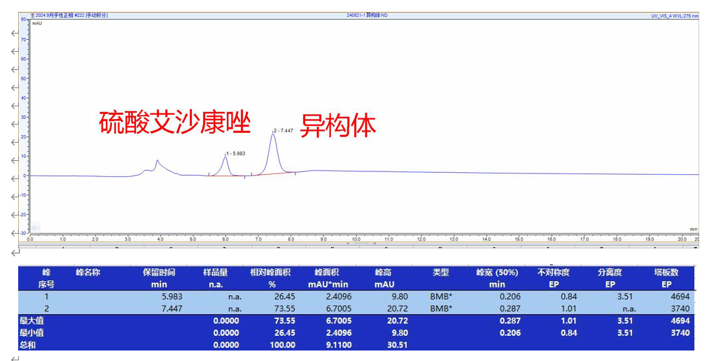 硫酸艾沙康唑及其對映異構體的手性拆分 色譜柱:Chiral ND(2) 5u 250*4.6mm (P/N: FMG-AC5-A01-NFC) 流動相:正相(咨詢) 柱溫:25℃ 流速:0.8 mL/min 檢測波長:275nm 濃度:N/A 溶劑:30%乙腈 色譜圖: