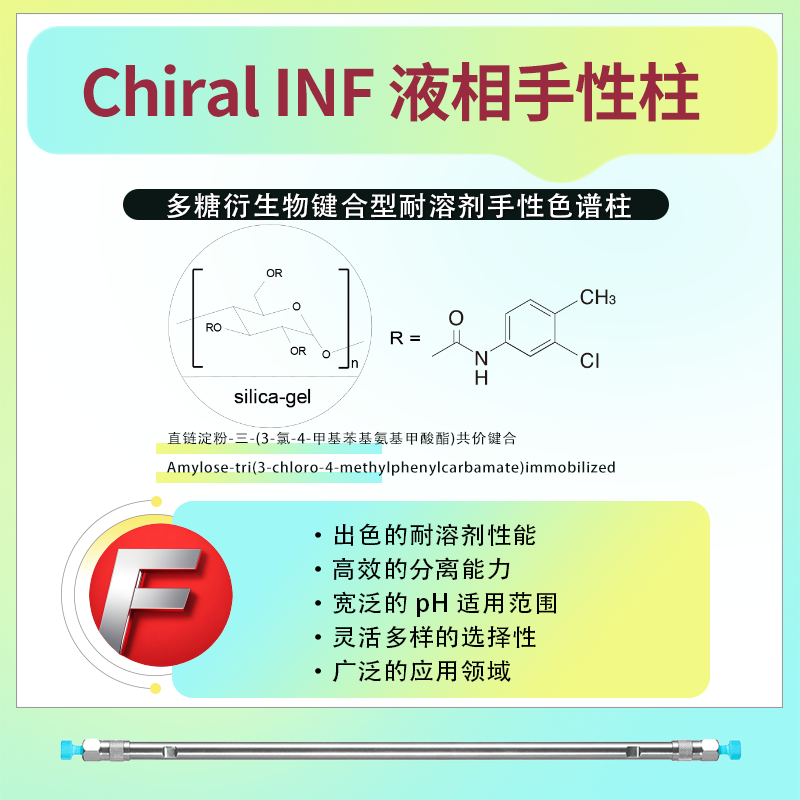 Chiral INF 鍵合型耐溶劑手性柱的固定相為直鏈淀粉-三-(3-氯-4-甲基苯基氨基甲酸酯)共價鍵合,Amylose-tri(3-chloro-4-methylphenyl 二、使用條件 壓力:為了延長手性柱的使用壽命,建議保持壓力在30MPa以下。這有助于減少色譜柱的磨損和性能下降。 pH值:該手性柱適用于pH值范圍在2.0至9.0之間的溶液。這提供了廣泛的適用性,適用于多種實驗條件。 溫度:建議在0℃至40℃的溫度范圍內使用,以確保色譜柱的穩定性和分離效果。 三、可使用的溶劑 Chiral INF 鍵合型耐溶劑手性柱可使用多種溶劑,包括: 正相溶劑:如n-Hexane(正己烷)、IPA(異丙醇)、EtOH(乙醇)等。 特殊流動相:如Ethyl acetate(乙酸乙酯)、CH3Cl(氯仿)、THF(四氫呋喃)、MTBE(甲基叔丁基醚)等。 反相溶劑:如H2O(水)、IPA(異丙醇)、MeOH(甲醇)等。 這種廣泛的溶劑適應性使得該手性柱在實驗和分析中具有更高的靈活性和適用范圍。 四、產品規格與訂貨信息 Chiral INF 鍵合型耐溶劑手性柱具有多種規格,以滿足不同實驗和分析需求。常見的規格包括不同粒徑(如5μm、3μm等)、不同長度(如250mm、150mm等)和不同內徑(如4.6mm、2.0mm等)的色譜柱。具體訂貨信息: