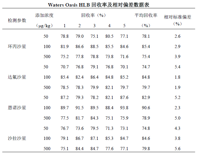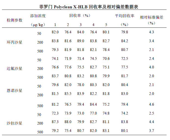 對照組采用菲羅門公司PolyClean X-HLB 60mg/3ml 與Waters 公司Oasis HLB(60mg,3cc)固相萃取柱,其余步驟相同。