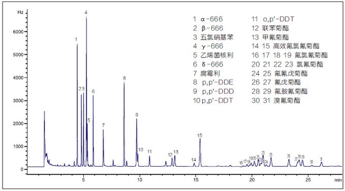 圖 1 添加水平為 0.2mg/kg 黃瓜中有機(jī)氯和擬除蟲菊酯類農(nóng)藥多殘留檢測(cè)色譜圖