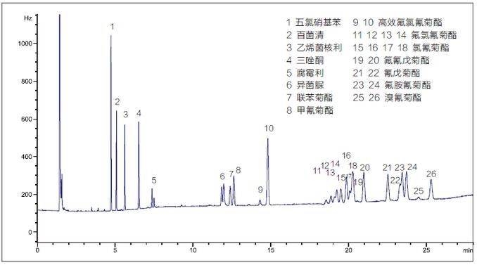 圖1 添加水平為0.2mg/kg大米中有機(jī)氯和擬除蟲菊酯類農(nóng)藥多殘留檢測(cè)色譜圖