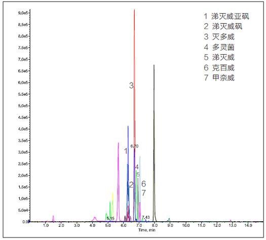 圖2 添加水平為0.05mg/kg大米中氨基甲酸酯類農(nóng)藥多殘留檢測(cè)色譜圖